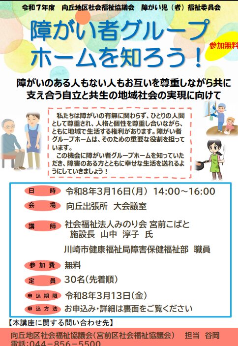 ◆向丘地区社協主催『障がいグループホームを知ろう!』講座開催のお知らせ◆